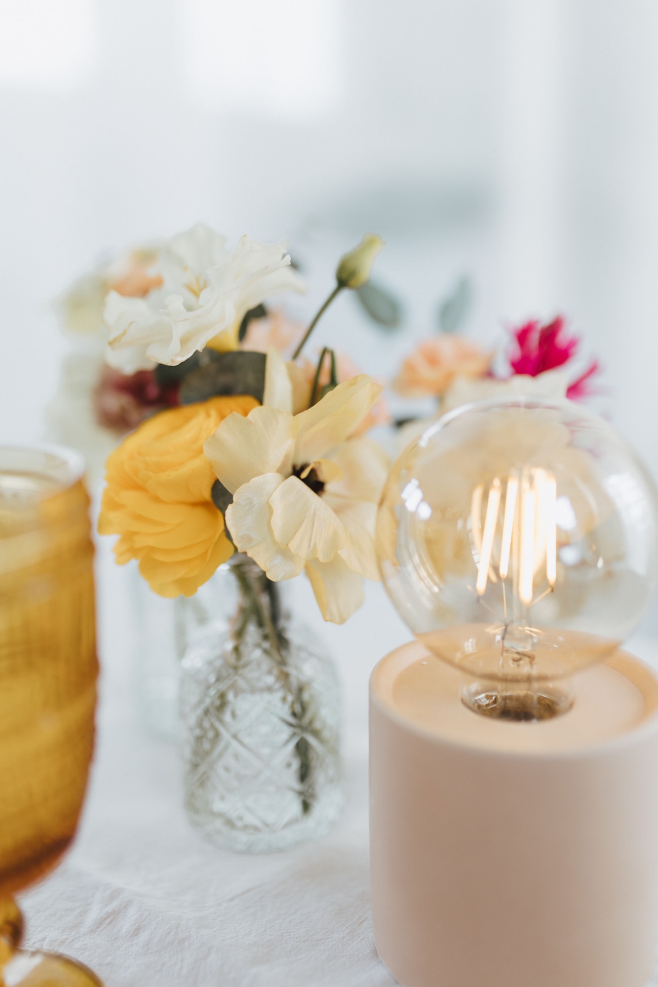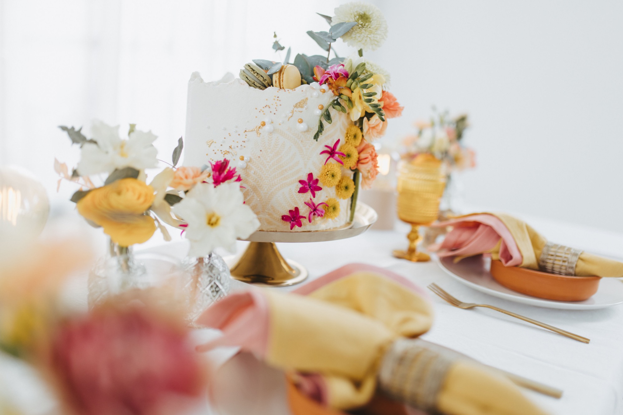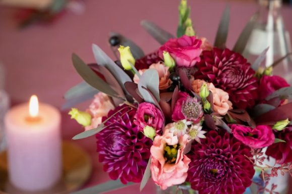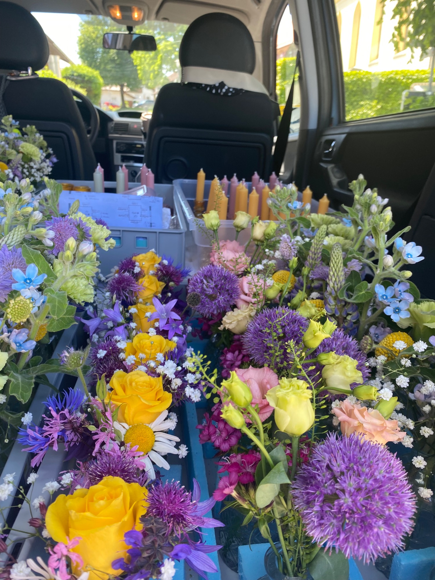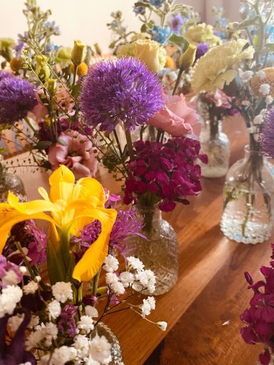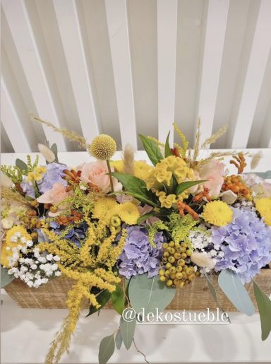 Bei dieser Hochzeit wurde einfach gewünscht, dass es farbenfroh und bunt sein soll. Das haben wir geschafft mit gelben Glaskerzenständer und einem Meer aus verschieden heimischen Blumen.