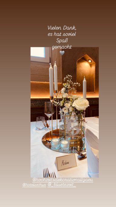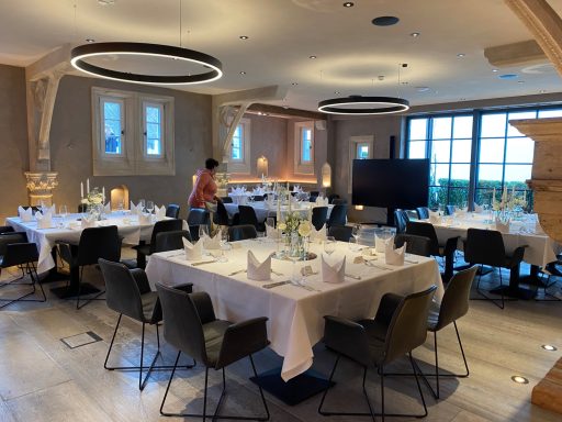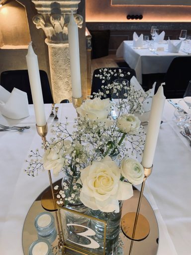 Der Ritterkeller hat ein sehr schönes elegantes und schlichte Einrichtung, daran haben wir uns orierntiert. Wir haben eine golde- weiß-creamfarbige Dekoration gewählt, passende zur Raum.
