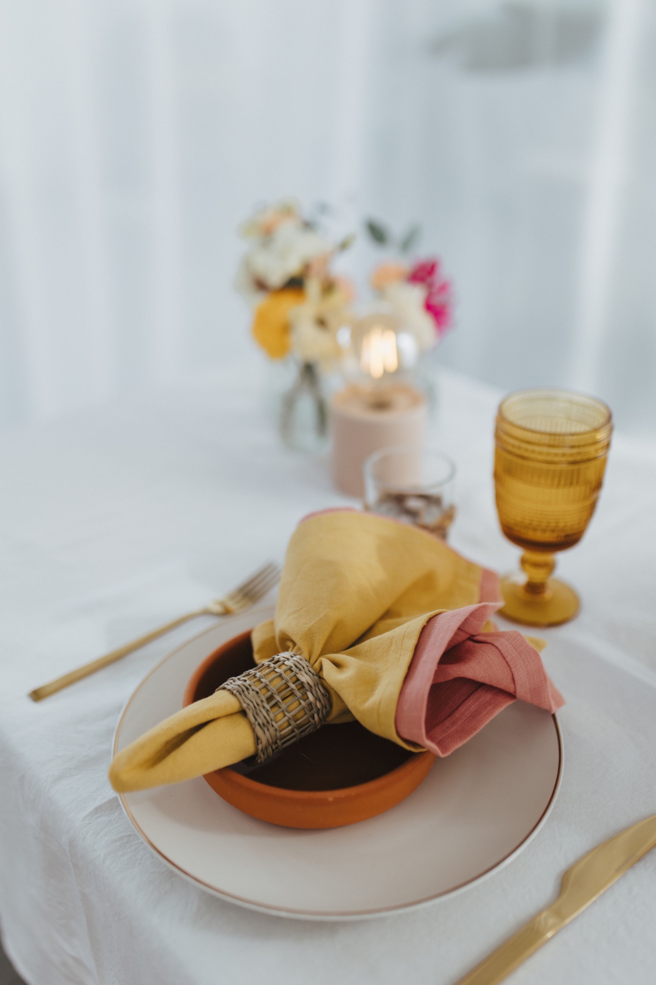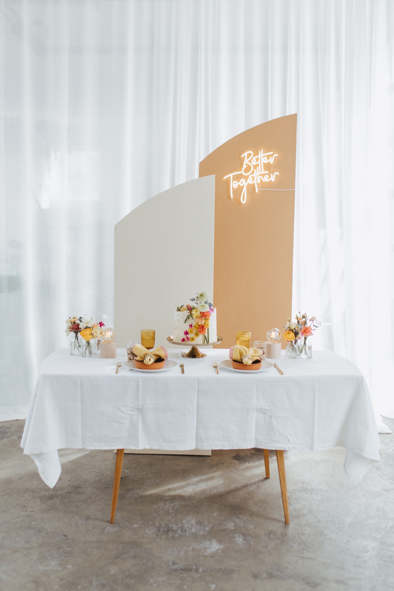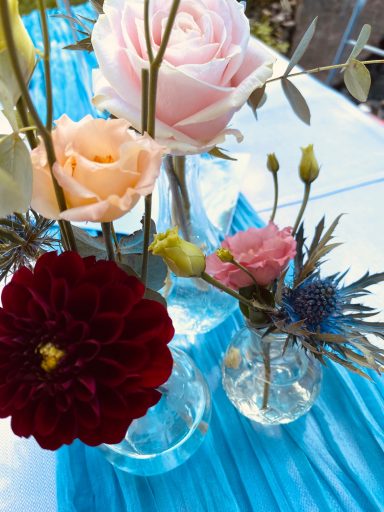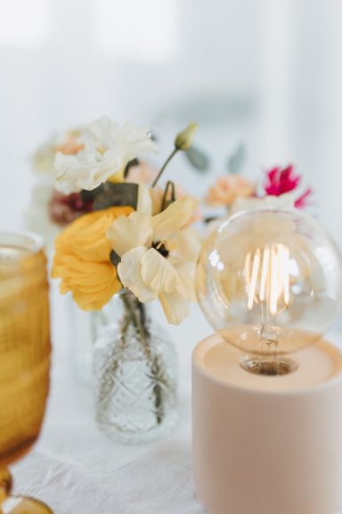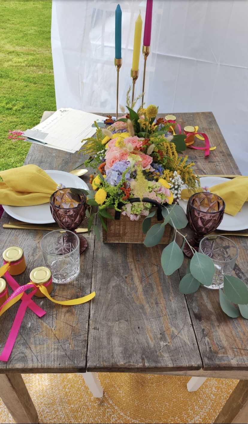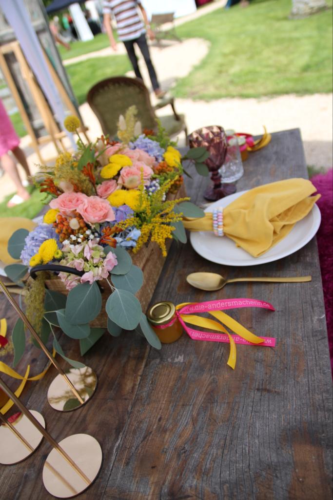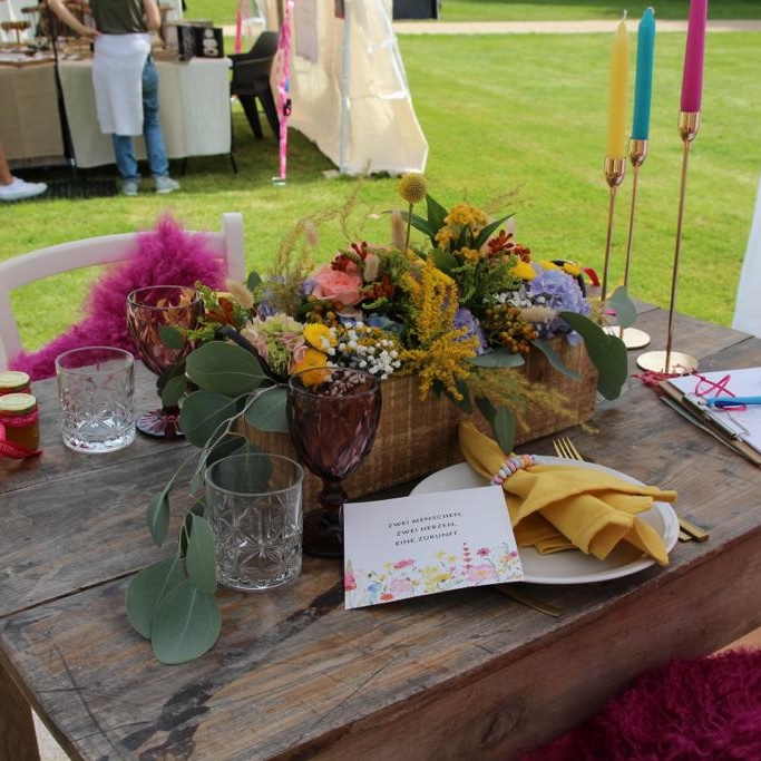Zusammen haben wir ein fröhliches und farbenfrohes Konzept erstellt. Es war uns wichtig, dass es keine Kerzen gibt sonder LED Lampen auf den Tischen.