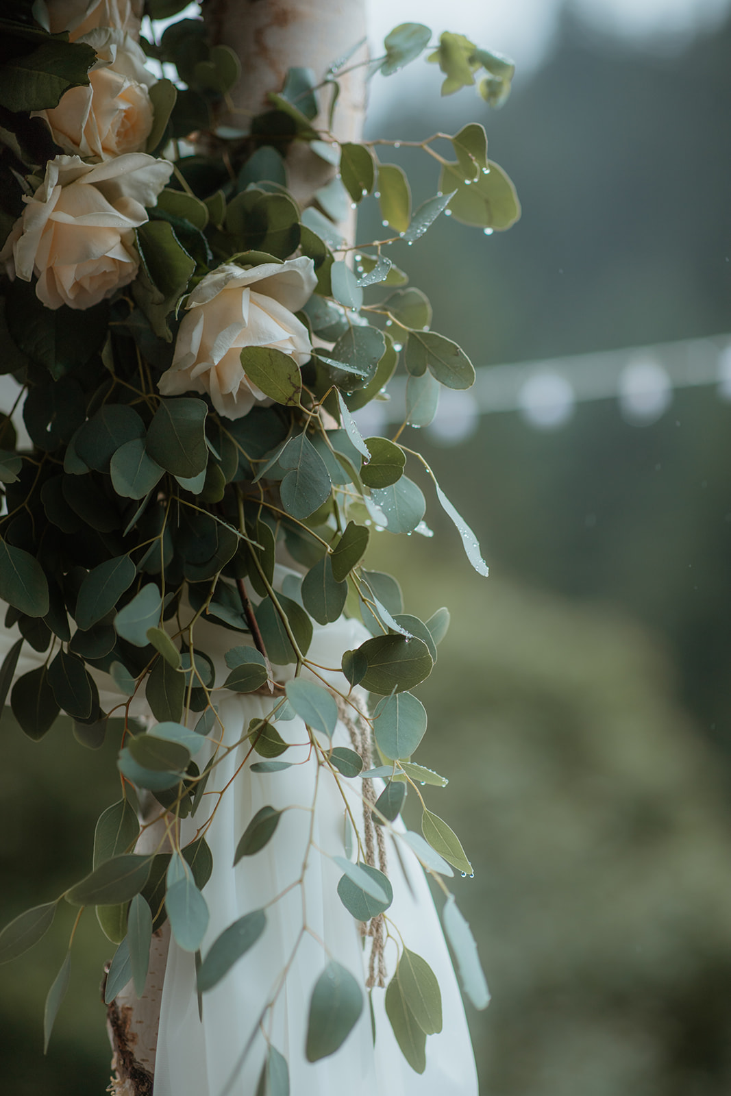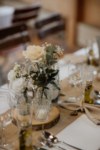 Wir haben auf einer kleinen Alp gefeiert, die Hochzeitsdekoration sollte elegant aber auch mit vielen natürlichen Element dekoriert sein. Deshalb haben wir uns für Holzscheiben und Juteläufer entschieden. Die Rosen in einem roseton gibt den gewünschten glanz.